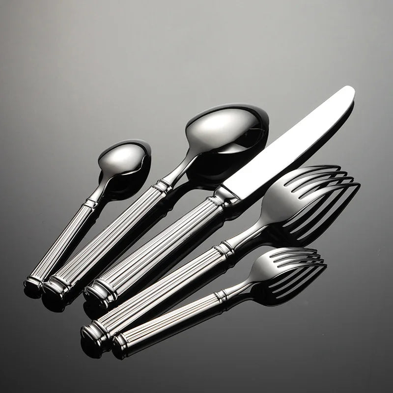 This cutlery set includes five essential dining pieces, each crafted in the same elegant Roman-column handle design. Inside the set you’ll find a dinner knife for everyday meals, a matching dinner fork and a smaller fork ideal for salads, starters or desserts. The set also features a deep dinner spoon suited for main dishes or soups, along with a tea and coffee spoon for hot drinks and serving small desserts. Together, these pieces create a complete and balanced table setting, suitable for both daily use and formal dining.